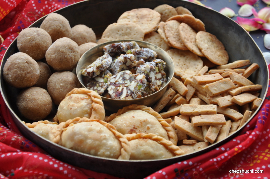 There is a tradition to make some Indian sweets and snacks in advance for bhog and also to share with friends and family. One can make a variety of laddus, barfi, halwa, mathri, and a lot of other stuff as per time, taste, and budget.The above platter has