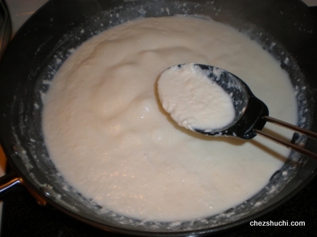 - एक भारी तली के बर्तन में दूध उबालिए. पहला उबाल आने के बाद आधी फिटकरी दूध में डाल दीजिए और दूध को बराबर चलाते रहिए. कुछ ही देर ( लगभग 2 मिनट) में आप दूध में दाने और मलाई देखेंगे. दूध को तेज आँच पर बराबर चलाते हुए 5 मिनट तक पकाएँ.