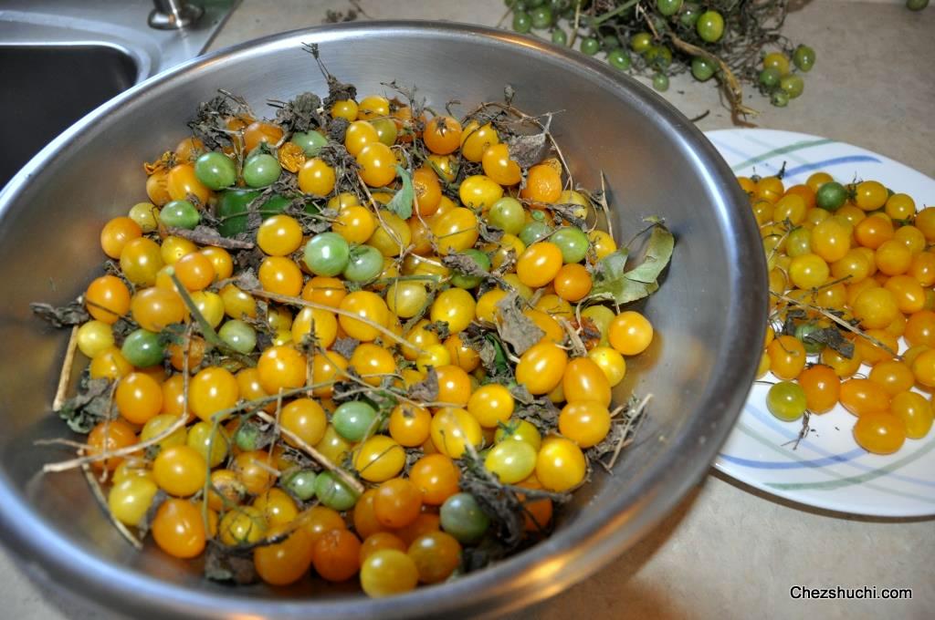 Now we are back to picking up these tiny little tomatoes, cleaning them, and sorting them. In order to store these I either make onion tomato masala, and freeze the tomatoes for using them later. This masala is ready to use and saves cooking time. Since these tomatoes are yellow, the masala color is not red but tastes awesome.