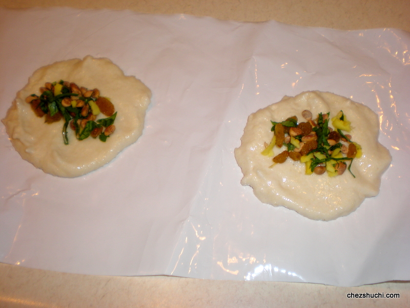 - Now put about 1- 1½ tsp filling in the center of the lentil circle. Please see the picture below to get a better idea.