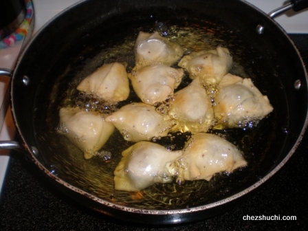 samosas after pouring into the warm oil